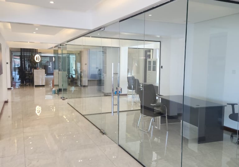 We supply & install frameless glass partitions in Kenya. We are Kenya’s top company that offers frameless glass partitions. Options for for glass include; 8mm, 10mm or 12mm clear laminated or toughened glass.